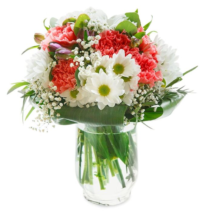 Brimming with joy and finely honed detail, this bouquet captures the heart of Noak Hill's local floristry. Radiant coral and deep red carnations take centre stage, their kite-like, frilled petals bringing depth and vibrancy to the scene. Nestled among them, fresh white daisies with glowing yellow-green centers add an airy contrast, their brightness echoing the mood of a carefree stroll down Straight Road. Airy sprigs of baby's breath-their tiny white blossoms like floating clouds-soften the overall texture, while subtle buds tinged with purple perched on the left introduce a quiet note of curiosity. Framing the florals, sturdy, broad green leaves stand in lush support, reminiscent of the tranquil woodlands near Noak Hill. The entire arrangement is nestled securely in a white square bag, finished with neat ribbon handles, and isolated against a luminous white background. This expert composition shines as a just-right gift for a birthday, a heartfelt congratulations, or a simple act of kindness, sharing the freshness and community warmth of Noak Hill with those who matter most. Expertly arranged, this bouquet is a luminous herald of Noak Hill's gentle seasons-crafted to embody joy, renewal, and heartfelt connection. At its centre, bright white daisies with lively green centers seem to smile among soft coral-pink carnations, whose ruffled textures bring a sense of playfulness and warmth. Airy clusters of baby's breath spill lightly between the flowers, evoking a clear spring morning near Pages Wood. Delicate alstroemeria buds, tinged with just a blush of mauve, add depth and artistry, while eucalyptus greenery-both silvery and deep green-creates a soothing, natural frame. The round, carefully balanced design feels both tranquil and jubilant, perfect for sending birthday wishes, brightening a Noak Hill home on a grey afternoon, or sharing gratitude with family. Ideal for local flower delivery across Noak Hill's residential neighbourhoods, this bouquet reflects a florist's careful eye and genuine love for the area, ensuring each recipient feels cherished with every vibrant blossom and softly fragrant leaf. Infused with natural elegance, this bouquet captures the relaxed countryside spirit of Noak Hill. The core is a lively burst of coral-pink carnations, their plush, frilled petals offset by bright, open white daisies and round chrysanthemums, each sporting a fresh green-yellow centre. Baby's breath, light as mist, mingles between the larger blooms, giving a sense of weightlessness beneath the surrounding envelope of glossy, deep green foliage and slender accent leaves. From one side, magenta alstroemeria buds peek out, promising colour yet to unfold. The arrangement sits in a clear glass vase, where clean water glimmers around steadily rising stems, reinforcing the impression of just-picked freshness. Even lighting ensures every petal and leaf is vivid and true, echoing the serenity and life found in Noak Hill's lovely fields. Whether for a joyful celebration or a spontaneous act of kindness, this bouquet brings an uplifting presence-bringing a breath of the local landscape indoors.